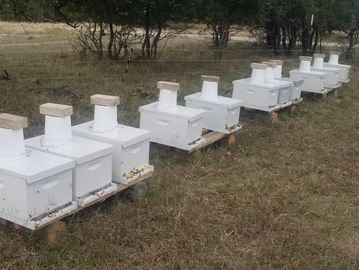 We are offering our fall nucs inside of 8 frame deep boxes. They will come with a bottom board, deep 8 frame box, lid and 8 frames. 5 of the frames will be drawn and covered in bees. This option is a great way to get them through the winter and then add a second box in the spring. All equipment is used but in workable shape.